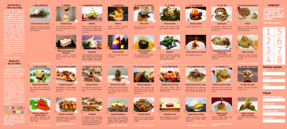 Els 32 locals participants aspiren a superar durant les quatre setmanes que dura l’edició número 12 de la Ruta de la Tapa de Vila-real, que és l’esdeveniment gastronòmic en el seu gènere més antic de la província de Castelló, les 28.000 racions servides i el volum de negoci de 93.000 euros de 2017. Aquests dies de més enfront l’any passat, permetran oferir del 12 d’abril fins al 6 de maig els aperitius més innovadors a veïns i visitants. El regidor de Turisme, Diego Vila, i el coordinador de la iniciativa, Lluís Ferriols, han donat compte d’una de les novetats d’enguany, la creació d’una nova pàgina web http://rutadelatapa.vila-real.es/ en la qual s’ofereix informació sobre els locals participants, les tapes que s’ofereixen, el preu, com participar i el mapa on se situen tots els negocis que s’han sumat a la iniciativa.